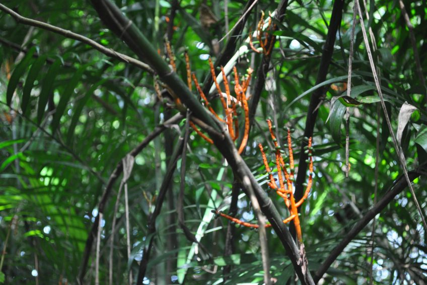 Chamaedorea seifrizii is a small, clustering palm growing to a height of 2.5 meters. Stem is green, up to 2.5 centimeters in diameter, with distinct annular rings. Leaves are petioled, pinnate, up to 60 centimeters long, dark green, gracefully arching, with slightly ribbed margins. Fruit is green, turning red to black, about 1 centimeter in diameter.